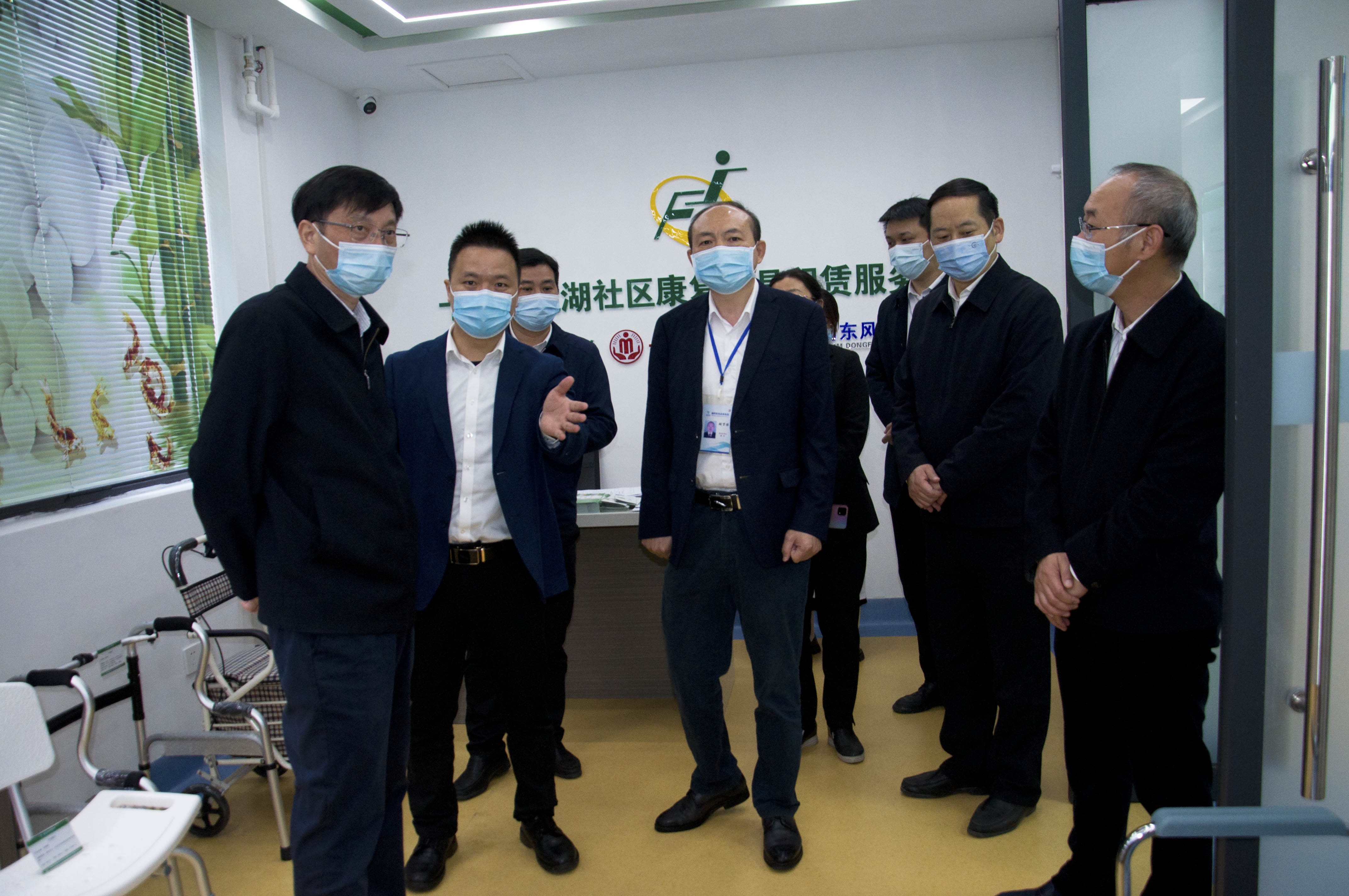 10 月 21 日上午,湖北省民政厅党组书记.厅长陈昌宏、社会事务处处长张玉水一行深入十堰市张湾区车城街 办艳湖社区调研指导康复辅具租赁服务工作。