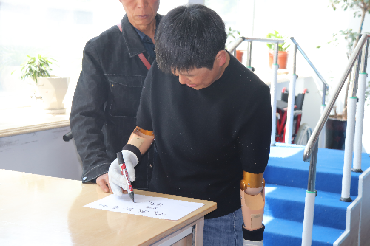 今天,卜昌娥来到十堰市辅助器具适配服务中心参加第三十四次助残日活动。在活动现场,穿戴假腿的卜昌娥灵活行走,并使用上臂肌电假肢抓取水杯,搬起板凳,开关房门,并写下图片中的文字,引来了参会人流的一阵阵侧目。”现在我在家还可以扫地做家务,大大的减轻了婆婆的负担。”卜昌娥兴奋的对大家说。据了解,2001年,卜昌娥意外触电失去了四肢,从此失去行动能力,生活起居、一日三餐均需婆婆周贤芝照顾,二人事迹还曾入选“中国好人榜”。为最大限度的让卜昌娥回归正常生活,2022年,十堰市残疾人联合会邀请十堰市辅助器具适配服务中心假肢专家专门为卜昌娥免费定制了假肢和假腿,帮助其获得了重新下地行走的能力。